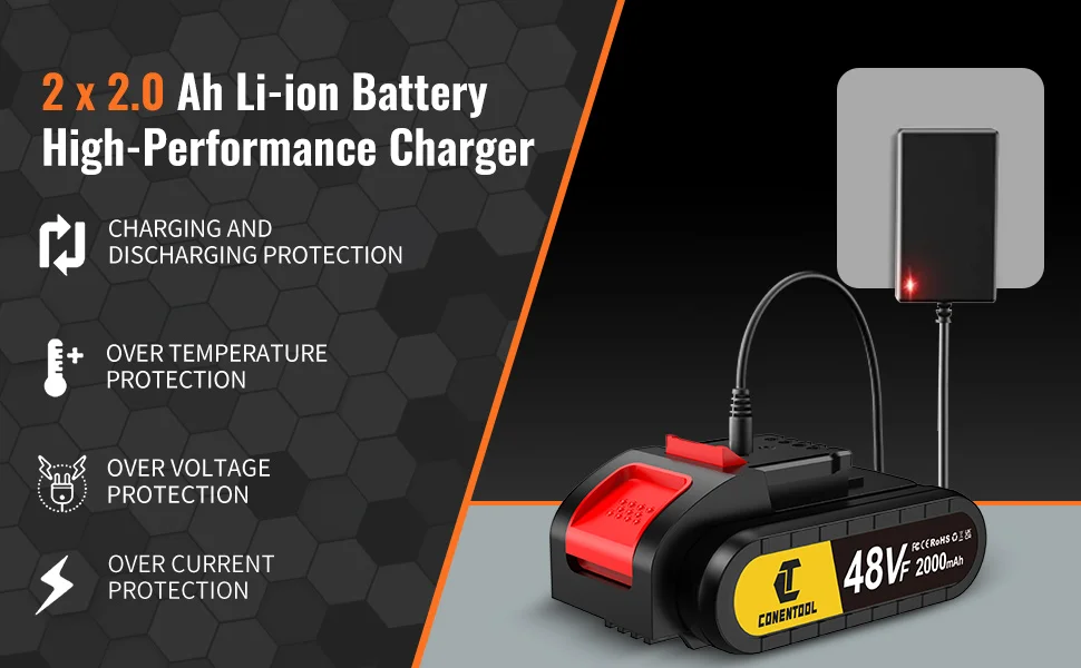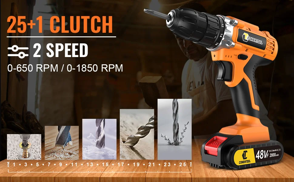 CONENTOOL 48V Cordless Drill Driver 25+1 Torque 45Nm 2 Speed