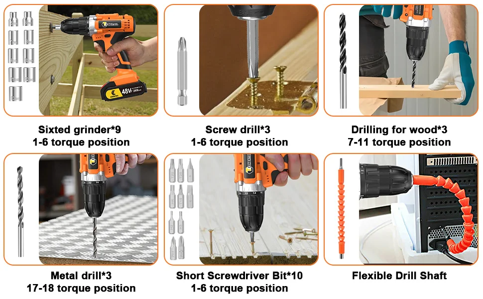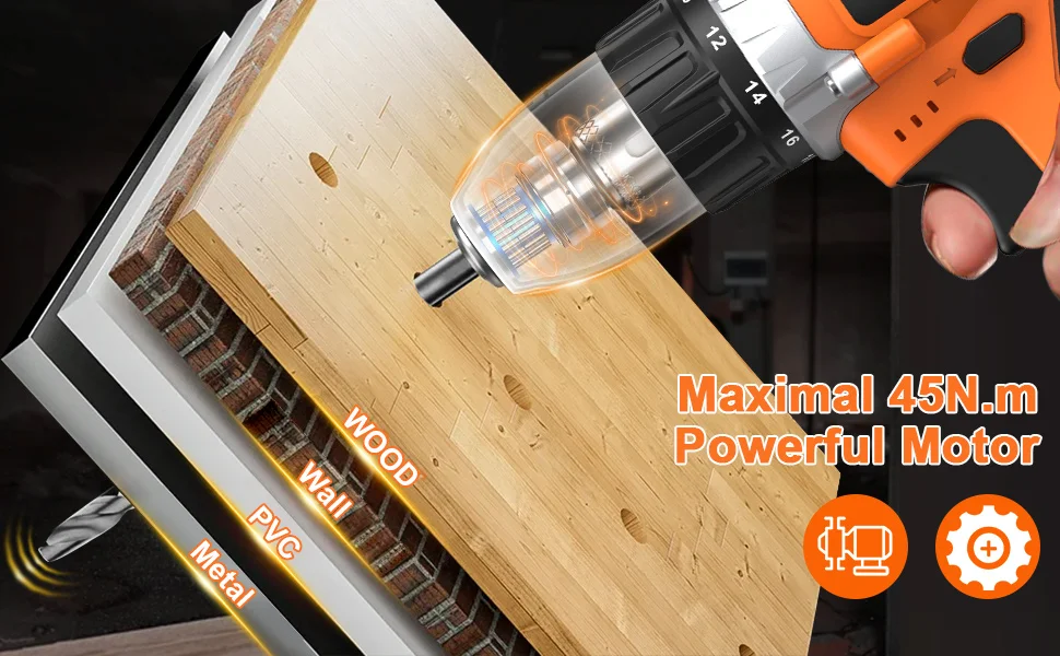 The 48V drill is equipped with a high-performance pure copper motor, delivering an impressive maximum torque of 45Nm. It excels in various drilling tasks, effortlessly handling ceramic tiles, thin metal sheets, wood, and screw-driving operations with precision and power.